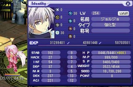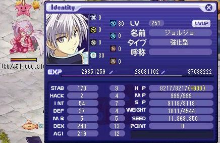 LV:240 STAB 1 HACK 2 INT 125 DEF 32 MR 161 DEX 220 AGI 192